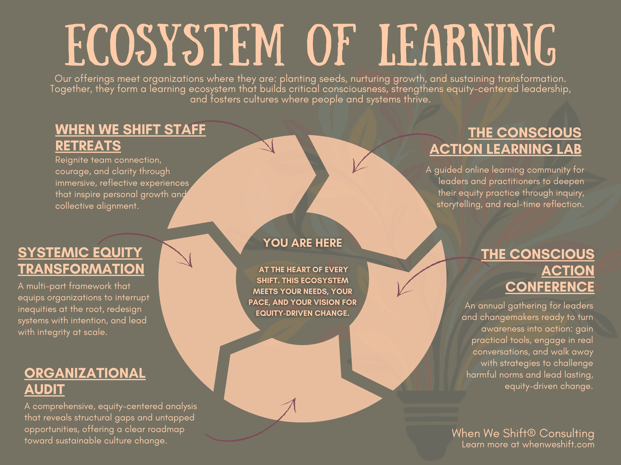 I’M PAIGE A. RIGGINS, FOUNDER OF WHEN WE SHIFT CONSULTING, A CONSULTING FIRM THAT SETS THE GLOBAL STANDARD FOR WHAT IT MEANS TO HAVE AN EQUITABLE WORKPLACE. THROUGH BUILDING ORGANIZATIONAL TEAMS’ CAPACITIES TO BUILD THEIR OWN EQUITABLE, INCLUSIVE, AND HIGH-IMPACT WORKPLACES, I EQUIP PEOPLE TO EXERCISE LEADERSHIP FROM THEIR SEAT TO DISRUPT HARMFUL SYSTEMS, POLICIES, AND PRACTICES, CENTER THE HUMANITY OF THEIR COLLEAGUES, AND LEAD LASTING INITIATIVES THAT RESULT IN MEANINGFUL CHANGE.